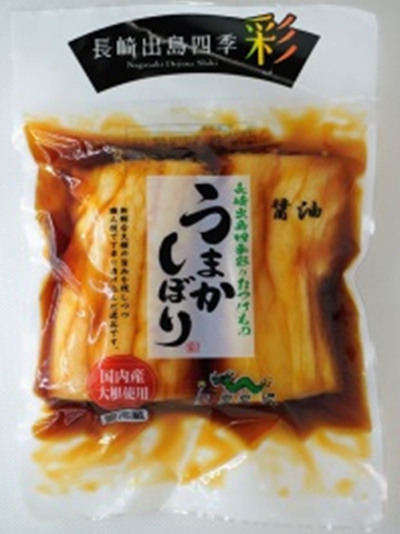 うまかしぼりとは全国各地より、契約農家さんとの協力がありその時、その場所で最適な品種を選び、新鮮な大根を人工甘味料や合成着色料を使わずに漬け込んでいます。大根の歯ごたえと甘みあるとても美味しいお漬物です。